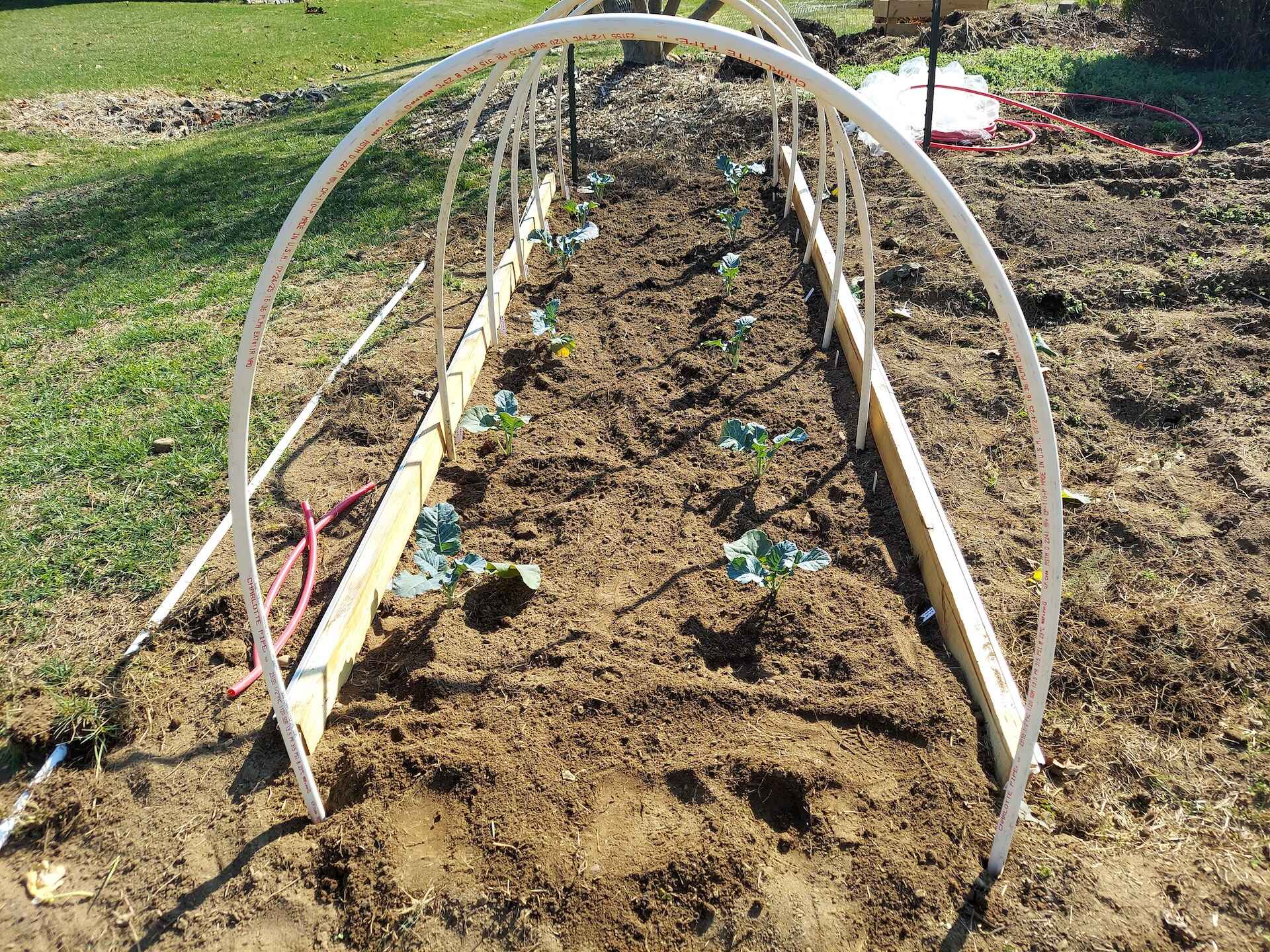 I think the weather is finally becoming more favorable, as temperatures are heading into the 60's, almost on a daily basis. I just finished putting in 12 broccoli plants from Holmes Seeds. They are good sized with lots of roots. I am going to buy some more 1/2 inch pvc think piping and make a second bed where I can put in hoops to protect the plants from the white moths that end up producing green catepillars that love the brassica plants (broccoli, cabbage and collards).